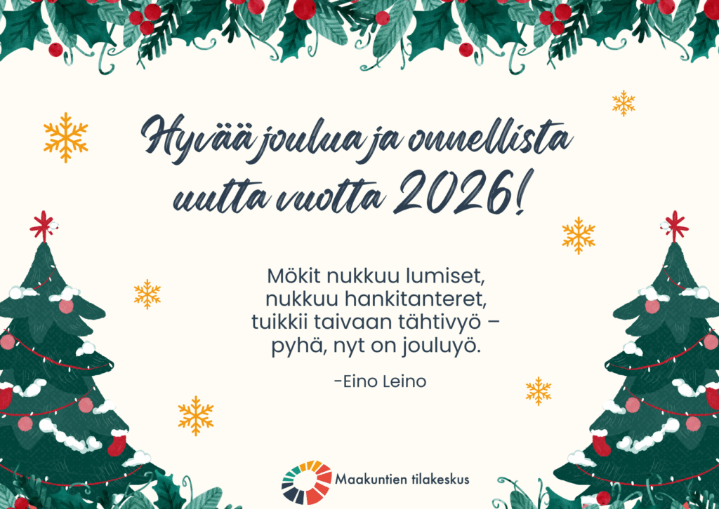 Hyvää joulua ja onnellista uutta vuotta 2026! torstai 18.12.2025 | henkilöstö ja organisaatio Jaa sosiaalisessa mediassa Lisää tästä aiheesta 10.12.2025 Joulutervehdys sidosryhmille10.12.2025 Maakuntien tilakeskuksen uutiskirje 12/20256.12.2025 Hyvää itsenäisyyspäivää!13.11.2025 Olemme mukana Lapset mukaan töihin -päivässä 21.11.20259.11.2025 Hyvää isänpäivää!