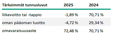 Yhtiöllä on kaksivuotisia vaikuttavuushankkeita, joita rahoitetaan yhtiön omasta pääomasta. Tästä syystä tilikauden 2025 tulos oli negatiivinen.
